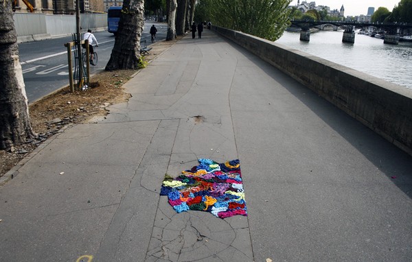 decided to decorate the cracks in the pavements of the Paris streets with fabric. We'd sure have a colourful country if we did that here... Love it!